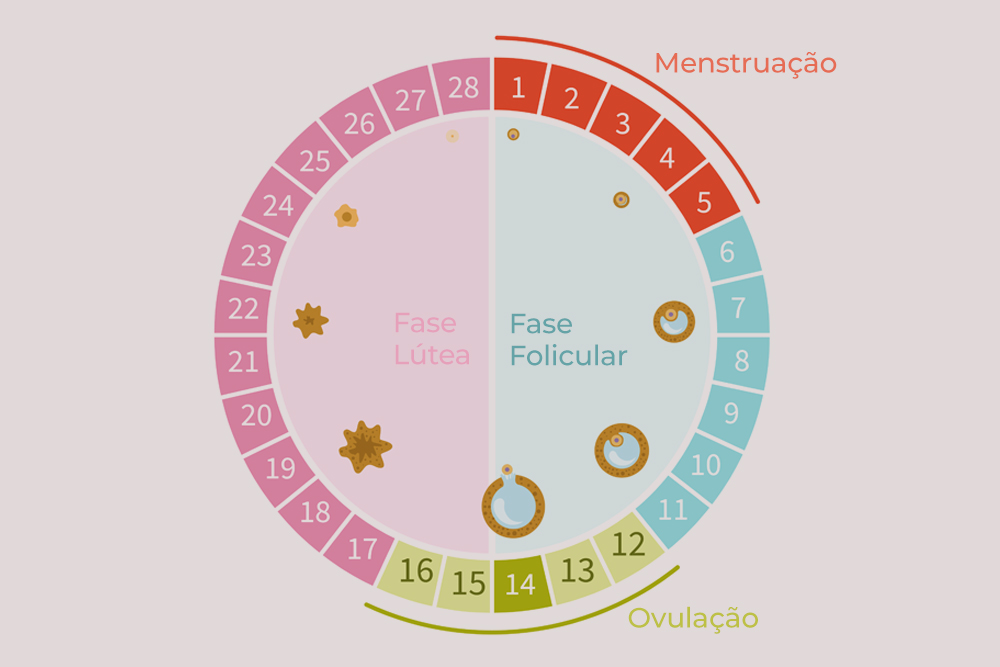 O ciclo menstrual é regulado por uma complexa interação de hormônios secretados pela hipófise e pelos ovários. Um ciclo regular tem duração aproximada de 28 dias e passa por 2 fases: folicular e lútea. A ovulação está no centro, marcando a divisão dessas duas fases.